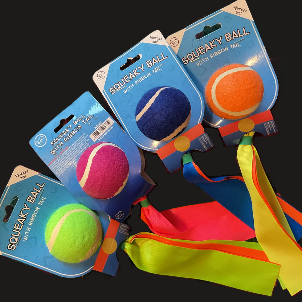 Delight your furry friend with our Tennis Ball style squeaky toy with rainbow ribbon.